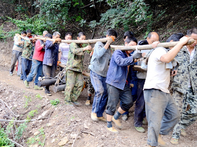 圖為鉆機(jī)施工人員在搬運(yùn)設(shè)備。